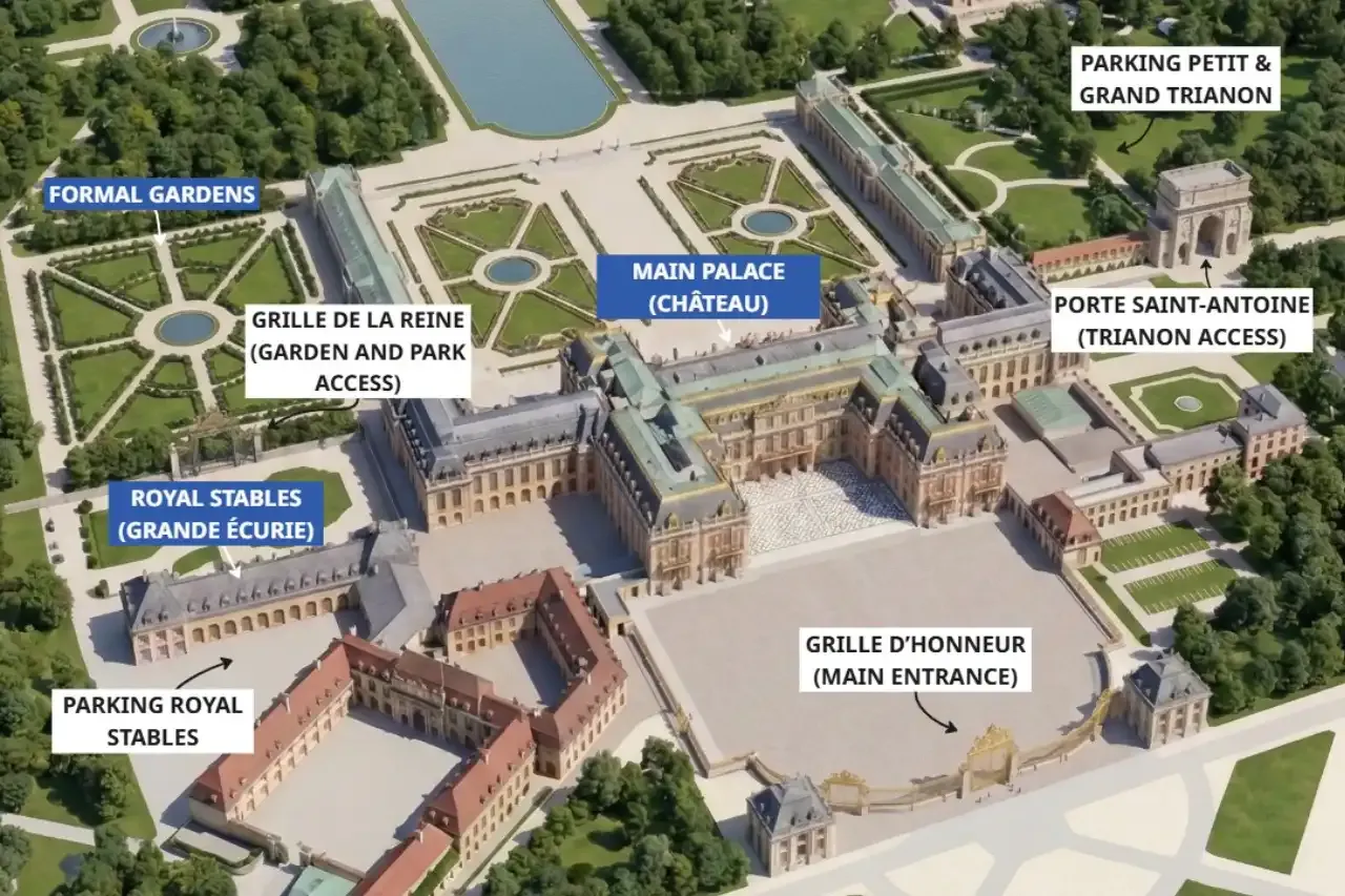 Besucher finden mehrere Möglichkeiten, wenn sie überlegen, wo sie am Schloss von Versailles parken können, um Zugang zum Schloss und zu den Gärten zu erhalten:
