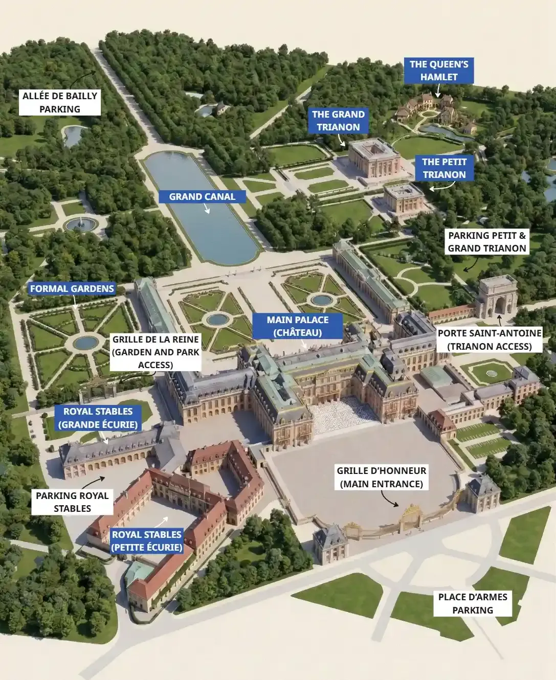 Die Karte der Parkplätze von Schloss Versailles zeigt vier zentrale Parkbereiche, die über das historische königliche Anwesen verteilt sind. Sie markiert die zentralen Parkplätze Place d’Armes und Royal Stables am Stadteingang sowie die Zonen Trianon und Allée de Bailly weiter im Park. Dieser visuelle Leitfaden hilft Besuchern, sich zwischen den Zugangspunkten in der Innenstadt und den Waldgebieten zurechtzufinden, während sie ihre Route zum Hauptschloss planen.