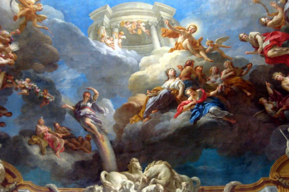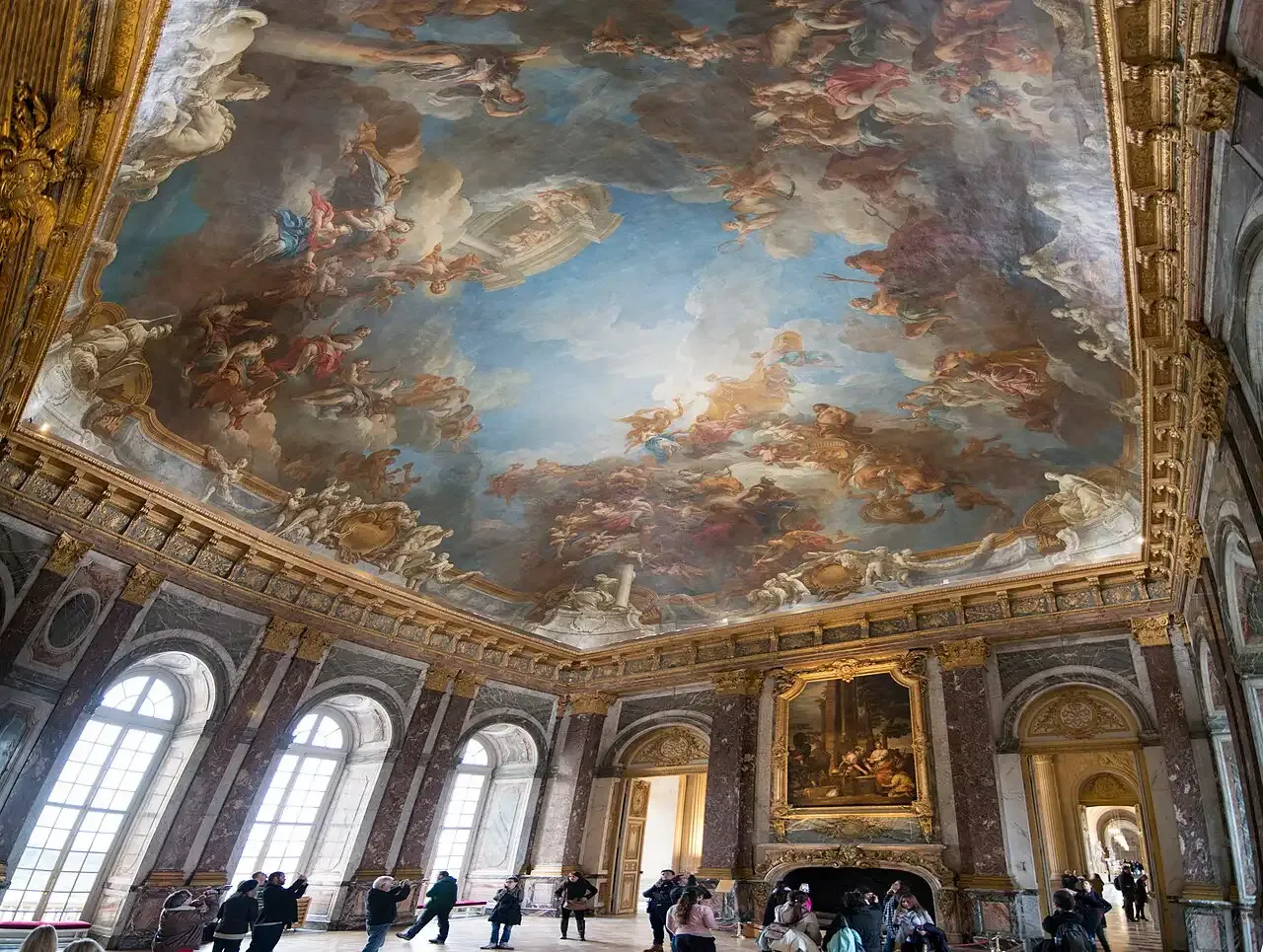 Versailles had no single painter. Le Brun's Hall of Mirrors program is the best-known ceiling work in the palace, while the most shared image online is Lemoyne's Salon of Hercules ceiling, misattributed to Michelangelo in post after post. Each painter's work occupies a distinct gallery. The palace map and entrances page covers the layout of the State Apartments where these ceiling paintings are concentrated.